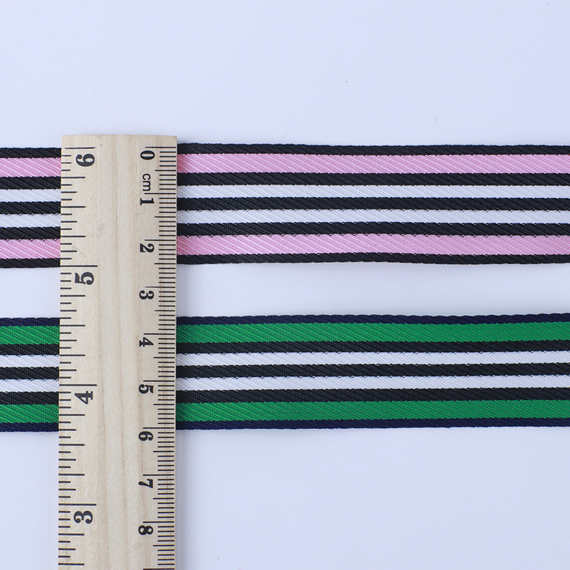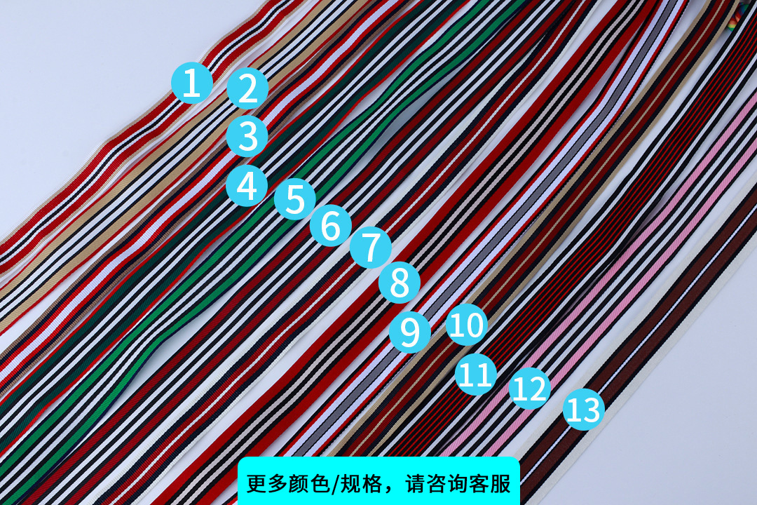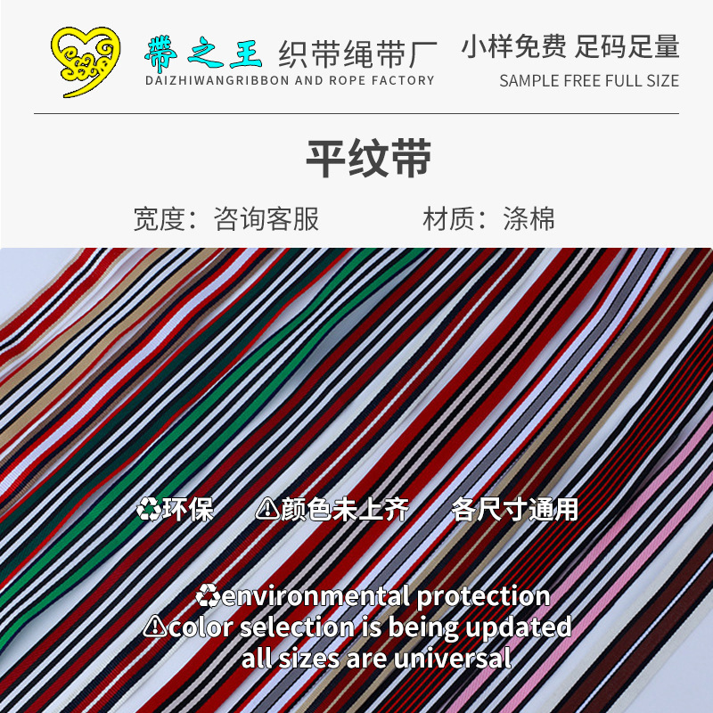 描述:涤棉竖条纹织带 双面平纹色织加密松紧带 多色条纹礼品盒包装带 材质:涤棉 适用范围:服装
